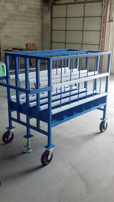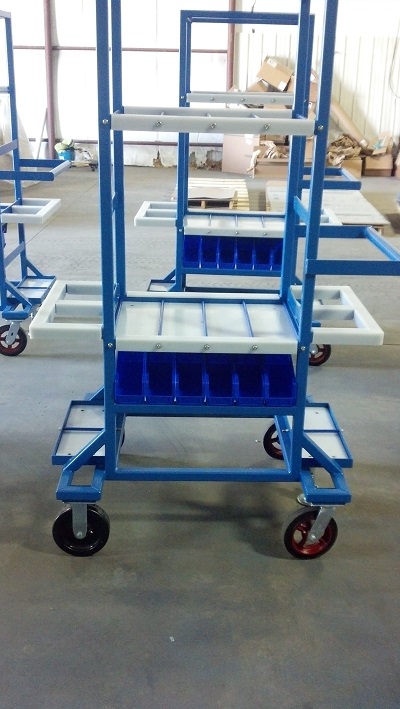 Fabricated carts custom designed to transport specific parts around a production facility.