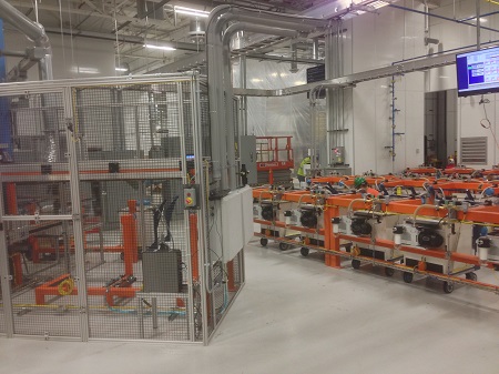A 5 axis servo driven gantry grips a part from the previous machine and loads it into a processing vessel which is RFID tracked thru the following processes.